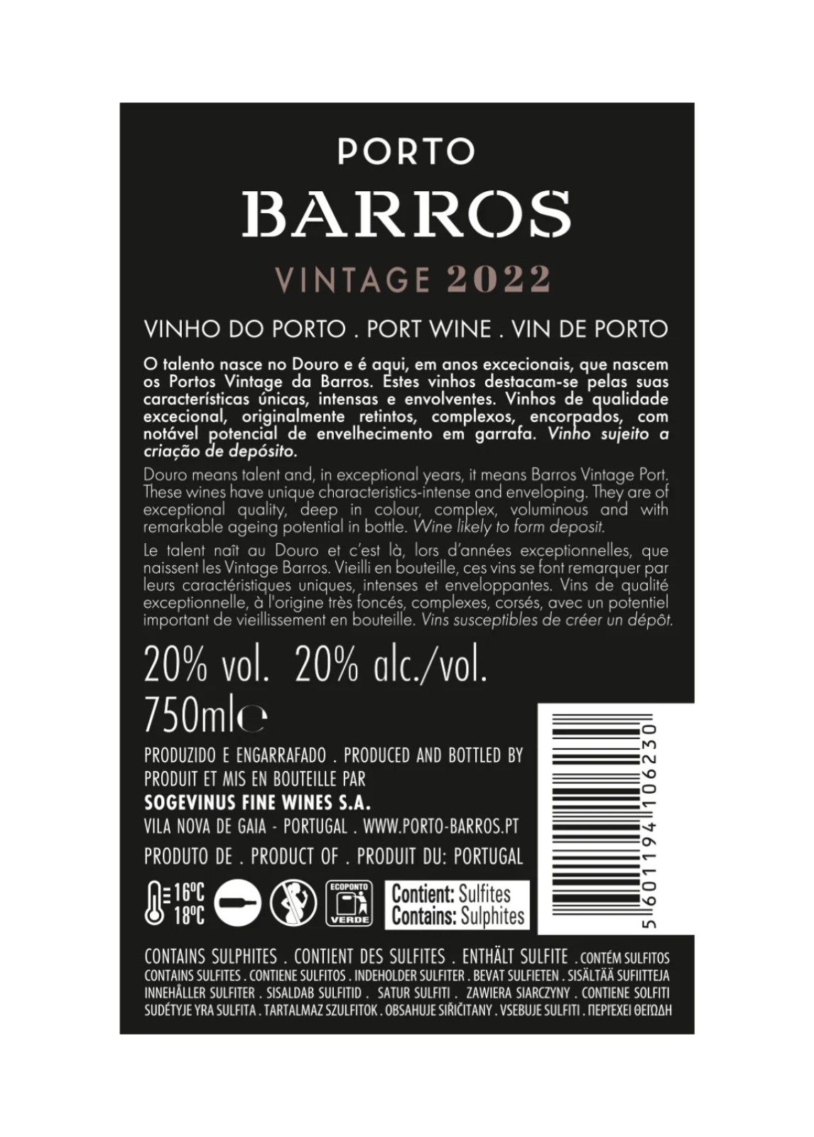 The 2022 Barros is deep opaque red colour. A clean Vintage port that displays notes of wild berries, such as blackberries and raspberries, and hints of menthol. Complex and elegant in the mouth, with flavours of fresh fruit wrapped in intense and silky tannins, it develops into a complex and engaging finish. Despite its ageing potential, this Vintage port's appealing character enables it to be enjoyed whilst young and it is therefore ideal for Vintage