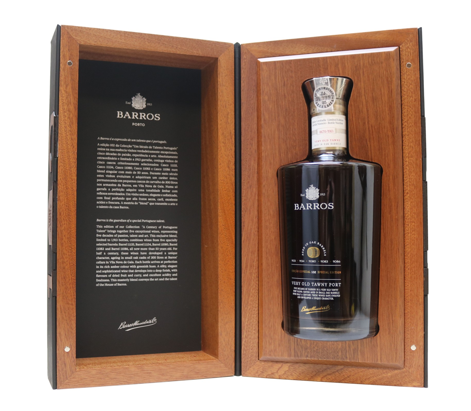 This limited edition Very Old Tawny port is blended from five different vintages from each decade from the 1950's to the 1990's representing 5 decades of wine making passion, talent and art. Having aged in small oak barrels over half a century, these wines have evolved and developed a unique character. This exclusive blend is limited to 1913 bottles only! Barros Special Edition 102 – Very Old Tawny completes the trilogy of wines that make the collection “A Century of Portuguese Talent“, created to celebrate the first centenary of the House of Barros, established in 1913.