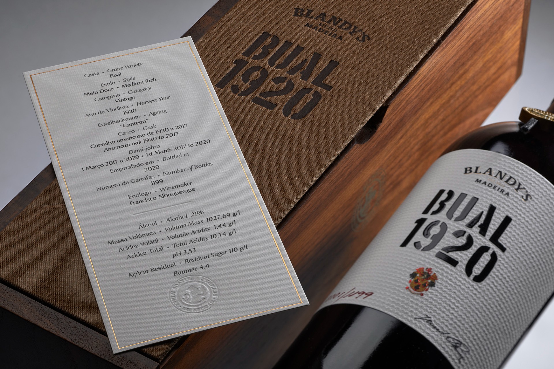 Delivers 110g/L residual sugar with 10.74g/L total acidity. Deep amber in color, it is endowed with a fabulous nose evocative of walking through a stately old English manor house; touches of dried honey, quince and barley sugar emerge with time. But overall, this 2020 Bual displays resinous aromatics, touches of lanolin and, later, a hint of sesame. The palate is very harmonious, with tangy marmalade and quince opening the show, followed by walnut, white pepper, clove, fennel and liberal shavings of ginger. It does not possess the length of the 1975 Terrantez or the 1976 Verdelho in this tasting, yet after a century it retains elegance and style, perhaps more so than previous releases. 1,199 bottles produced.