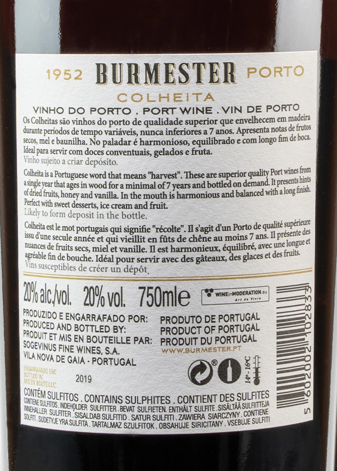 The 1952 Burmester Colheita Port is a classic wine of exceptional quality and elegance. The Port is made from a single harvest (a "Vintage Tawny") and aged in small 550-litre oak barrels in their Vila Nova de Gaia Cellars. It is bottled at least seven years after the harvest.