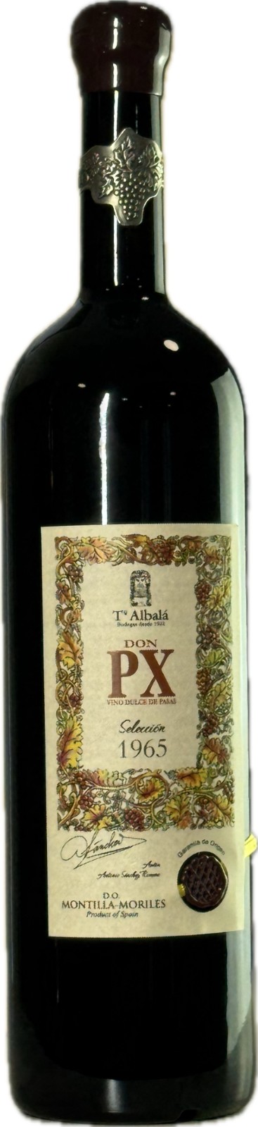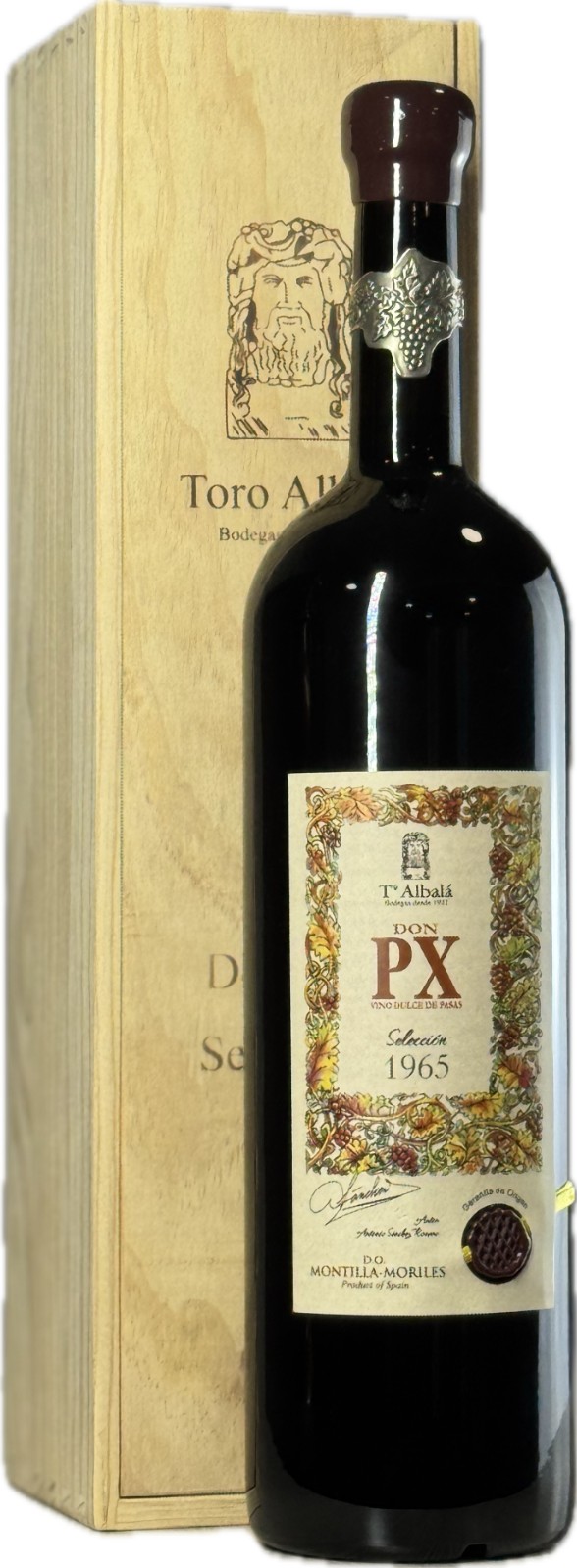 Don PX Selección 1965 Magnum from Bodegas Toro Albalá is an extraordinary aged Pedro Ximénez, drawn from a historic vintage and bottled in an impressive 1.5L format. This wine was aged in seasoned oak casks for decades, undergoing a slow oxidative maturation process that built layer upon layer of complexity. The magnum bottling ensures additional freshness and ageing potential, making it a rare and valuable find for collectors and connoisseurs of old fortified wines.
